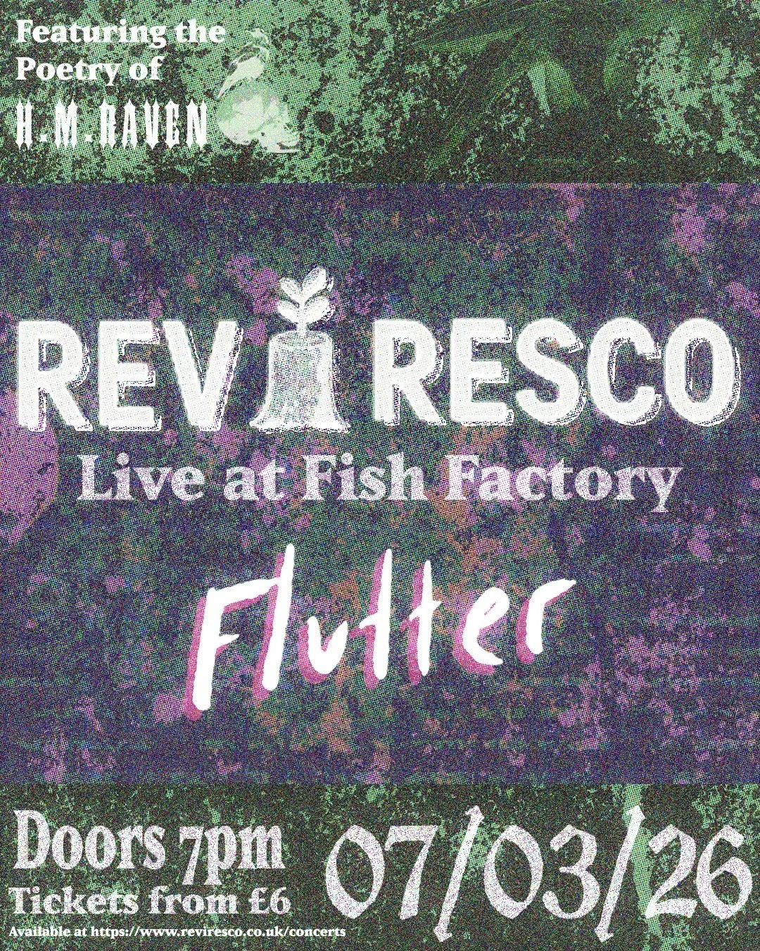 Reviresco’s debut headline concert, which sold out on the night. Supported by local math rock band Flutter and poetry legend HM Raven, the evening introduced material from the December live session alongside new pieces performed publicly for the first time, captured as part of the project’s growing live archive.